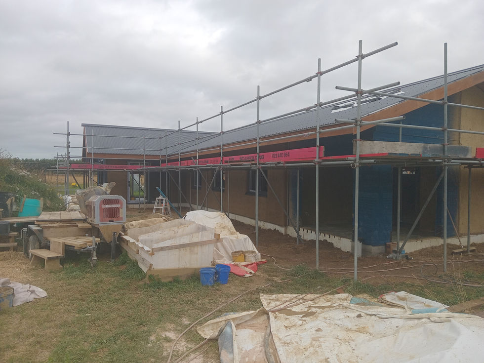 Everhomes has a plaster pump capable of quickly putting a mix of sand, clay and fibre onto the walls at speed, followed by a person hand troweling to get smooth surfaces and curves around windows. The final plastering is done by hand inside and out.